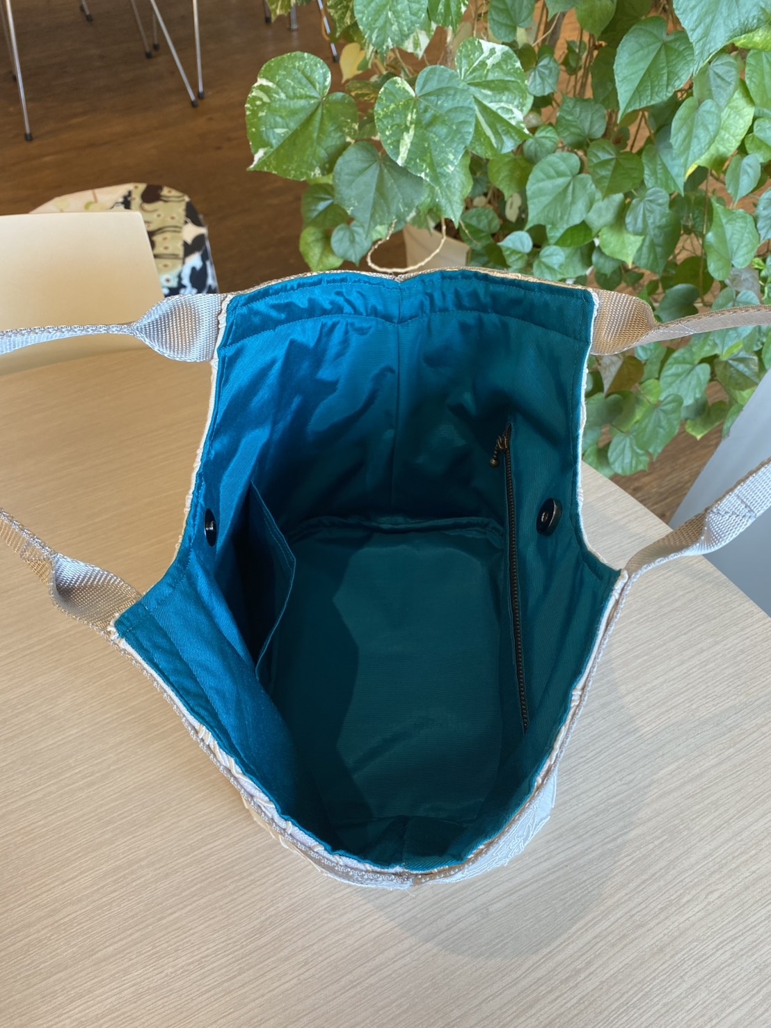 バッグの中は鮮やかなブルーで
