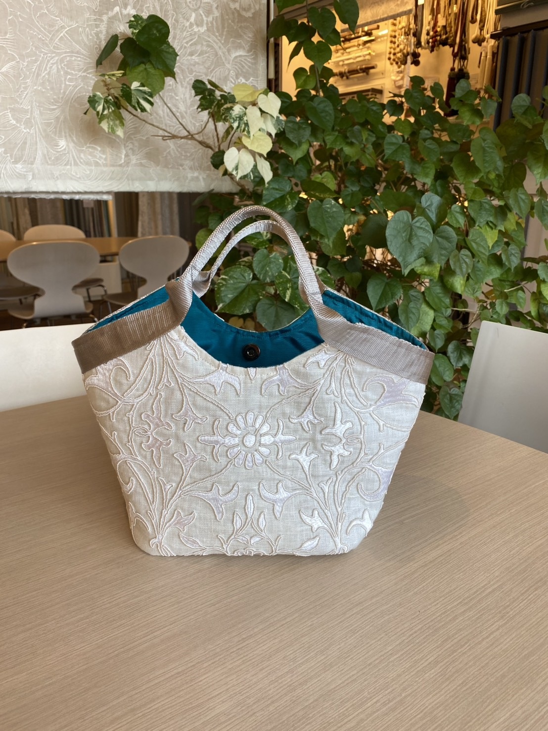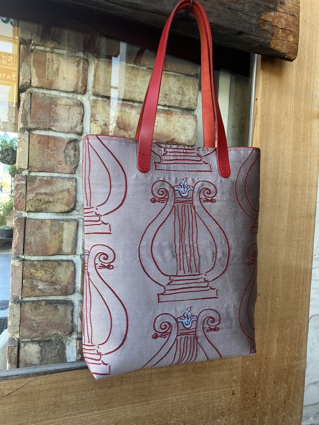 持ち手は生地でなく革で、これもモチーフの色に合わせて
