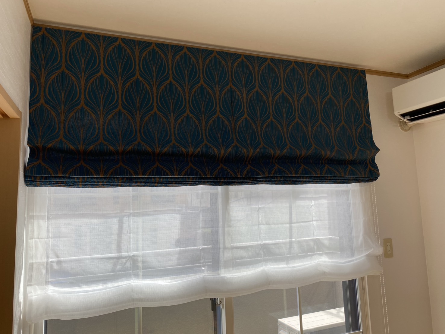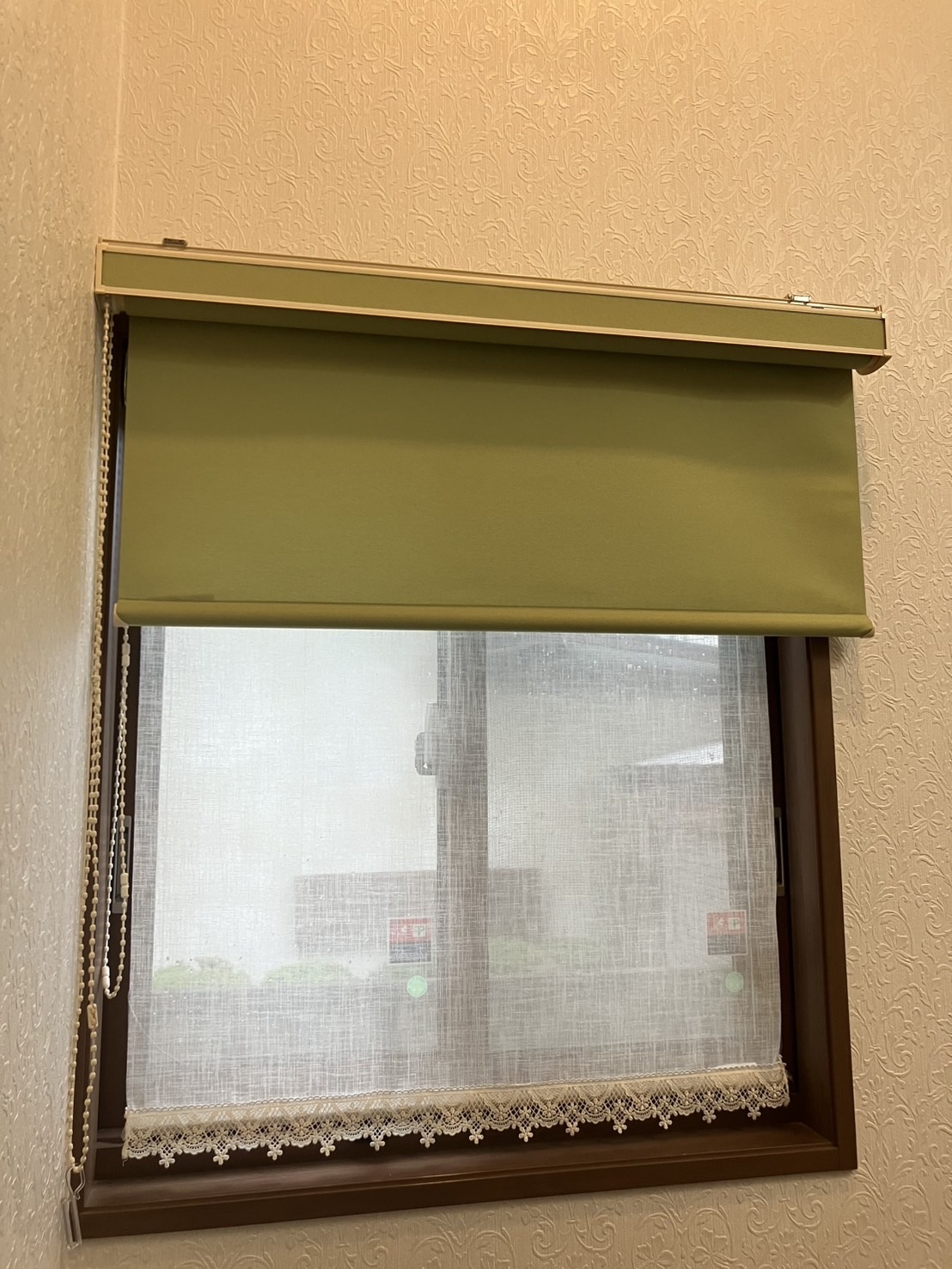 枠内のレースのロールスクリーンは既存を残して、枠外に新しくロールスクリーンを取付